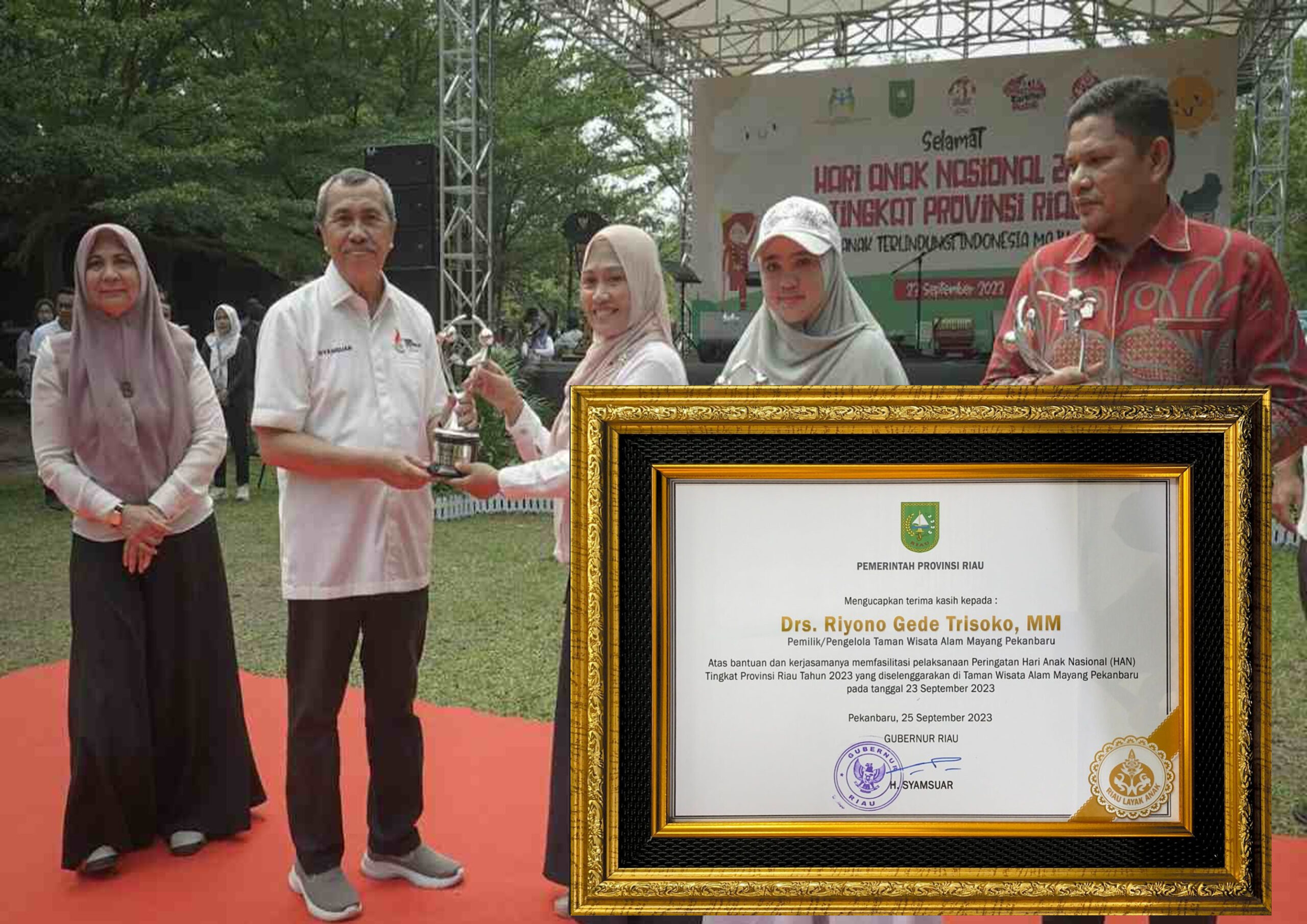 Puncak peringatan Hari Anak Nasional (HAN) tingkat Provinsi Riau 2023 dilaksanakan di Taman Rekreasi Alam Mayang, Kota Pekanbaru, Sabtu (23/9). Perayaan HAN tingkat Provinsi Riau merupakan suatu bentuk kepedulian pemerintah terhadap para generasi penerus bangsa. Kegiatan tersebut dimeriahkan oleh berbagai penampilan seni dari mulai anak PAUD hingga SMA/SMK sederajat. Tak hanya itu, Gubernur Riau (Gubri) Syamsuar juga memberikan penghargaan kepada tokoh inspiratif peduli anak dan pelayanan ramah anak.