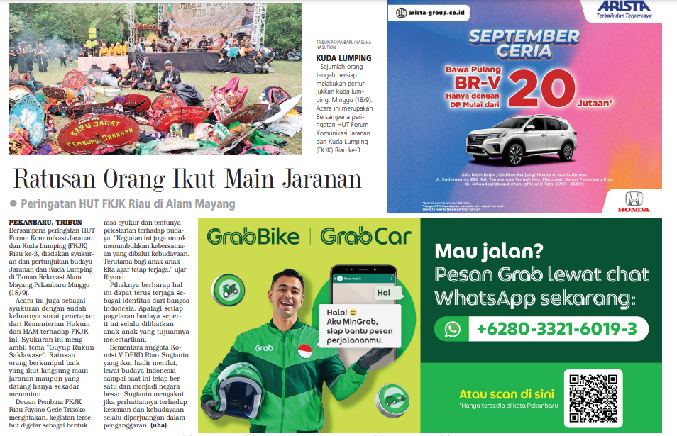 Ratusan orang berkumpul baik yang ikut langsung main jaranan maupun yang datang hanya sekadar menonton. Dewan Pembina FKJK Riau Riyono Gede Trisoko mengatakan, kegiatan tersebut digelar sebagai bentuk rasa syukur dan tentunya pelestarian terhadap budaya. “Kegiatan ini juga untuk menumbuhkan kebersamaan yang dibalut kebudayaan.